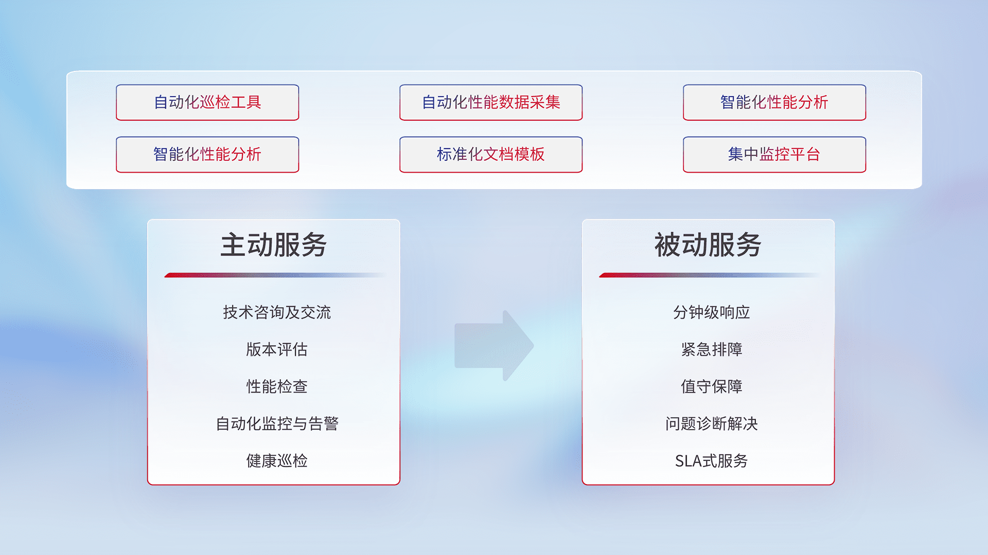 智能化工具和标准化文档,,,,保障服务质量,,,提供主动服务(包含技术咨询、、、、版本评估、、性能检查、、、自动化监控与告警、、健康巡检)和被动服务包含(分钟级响应、、、紧急排障、、、、值守保障、、、问题诊断解决、、SLA服务)。。。。